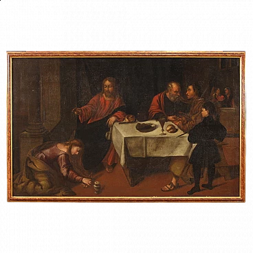 Oil painting on canvas from the 17th century depicting Mary Magdalene washing Jesus' feet. According to the Gospel of Luke, Jesus is a guest at dinner with Simon the Pharisee. Once at the table, a woman approaches his feet to wash them, drying them with her hair and anointing them with a fragrant oil. The identification of this woman, a sinner, with Mary Magdalene is the result of a series of misunderstandings and is now a repeated tradition in art history. The name Mary is recurrent in the Bible, and Pope St. Gregory the Great believed that she was the same person. There is no real textual connection that identifies Magdalene with the sinner in this biblical episode. The painting has undergone conservation restoration, frame replacement, color restoration in some spots and has been restretched. Fitted with a 20th-century carved, lacquered and gilded wooden frame. Without the frame it measures 112 x 184 cm.