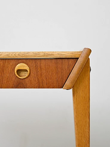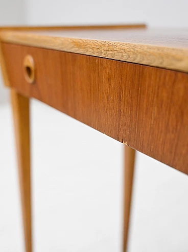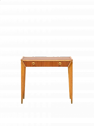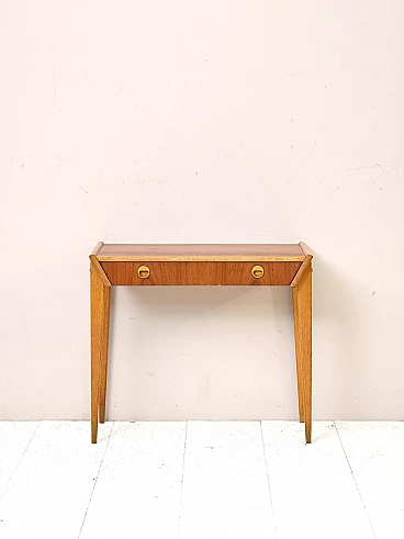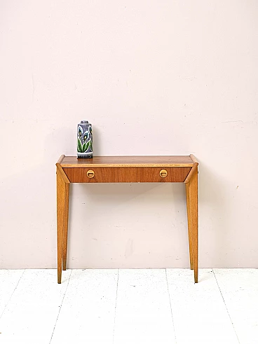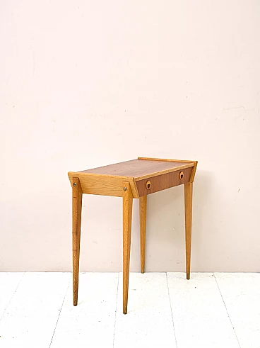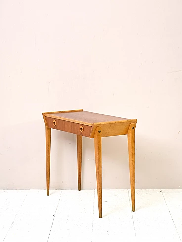Small vintage teak and oak console table. A piece of furniture with an original shape that is ideal for use as a drawer at the entrance to the home. The simple design and attention to detail make this small table a modern design piece with an unmistakable style. Good condition. Has been treated with natural products. It may show some signs of time. Please pay attention to the photos.