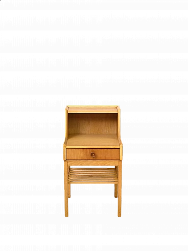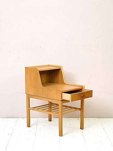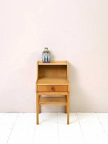 Vintage bedside table from the 1960s. This original bedside table is distinguished by its unusual shape given by the double shelf, which is very useful for placing a lamp and keeping the second shelf free. There is also a handy drawer and a magazine shelf made from strips of wood. Good condition. Has been treated with natural products. It may show signs of time. Please pay attention to the photos.