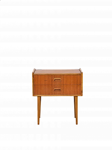 Scandinavian bedside table with two drawers, 1960s. Teak structure, birch legs and borders. It has been treated with products of natural origin.