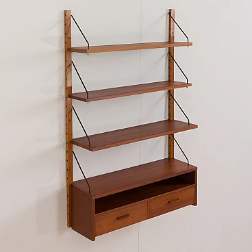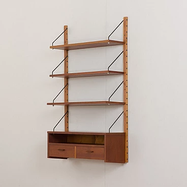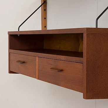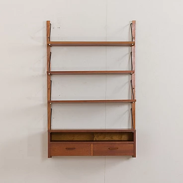 A vintage teak entrance bookcase with console and three shelves comes from 1960s Denmark. Simple yet elegant, it will enrich any entrance hall or bedroom. It consists of: two 20 cm deep shelves; one 24 cm deep shelf; one console with two drawers and one open shelf H: 26/ W: 75 / D: 26 cm, drawer height: 7 cm; two 120 cm long solid wood rails; black painted hardware.