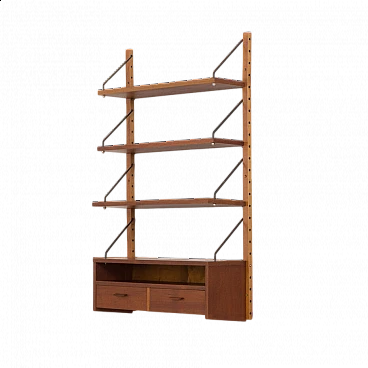This is a modular shelving system. All elements are 75 cm wide and can be arranged as desired. The shelves can be hung lower or higher, as can the console. the arrangement can also be reversed.