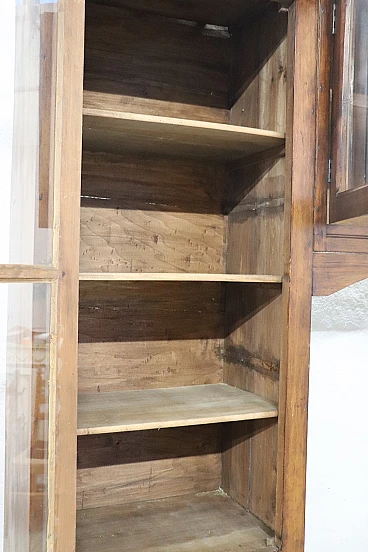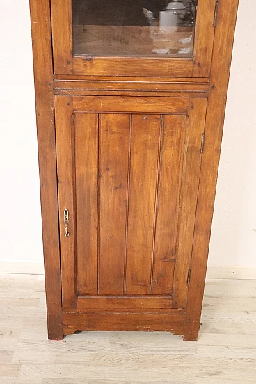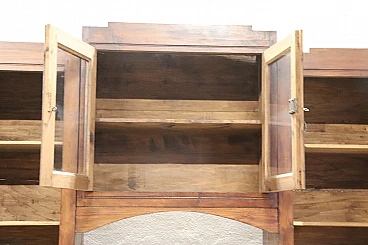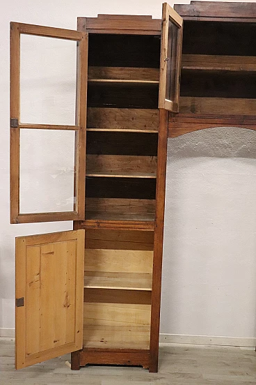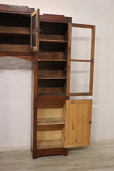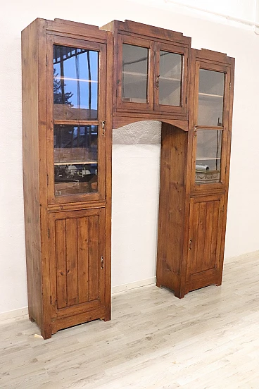 Beautiful and unusual antique rustic arched bookcase in solid fir wood dating from around the first decades of the 20th century, Art Nouveau period. Characterised in the upper part by glass doors for displaying objects or books, while in the lower part the doors have a closed panel. The particular arch shape allows it to become a decorative element in the room of extreme rarity. A small desk or any other decorative element can be placed in the central compartment. The warm tone of the fir wood makes it perfect for rustic country or mountain environments. Used but in good condition. We recommend that you take a close look at all the attached photos. This bookcase will be delivered in three unique blocks, the central block with arch glass. Offered at an excellent negotiable price, we invite you to send us your purchase proposals, we will gladly evaluate them. Height 247 cm, width 200 cm, depth 39 cm. Professional packaging, insured shipping by courier, delivery by appointment only on street level, no porterage on floors. Please note this item will be shipped disassembled, assembly is not included in the delivery, assembly can only be arranged for deliveries in the Alessandria area.
