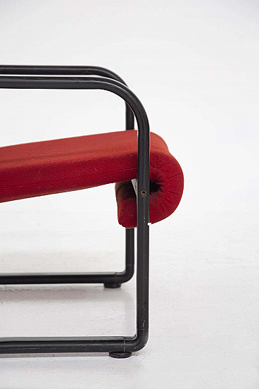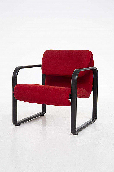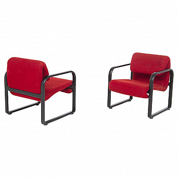 Pair of fabric and black iron armchairs designed in the 1960s by an unknown designer for the fine Italian manufacturer Arflex. The armchairs have sinuous and modern shapes, the frame is made entirely of black painted iron, very elegant, the legs are four but joined two by two. The armrests are also connected directly to the structure, also made of iron. On the backrest there is a low iron bar that connects the two armrests. The seat and backrest are both upholstered in bright, extravagant red fabric. The backrest folds inwards and creates a sinuous and beautiful ear. The seat connects to the frame via a curl at the bottom that folds over the iron frame, locking it in place. The armchairs are ideal for modern offices or study areas.