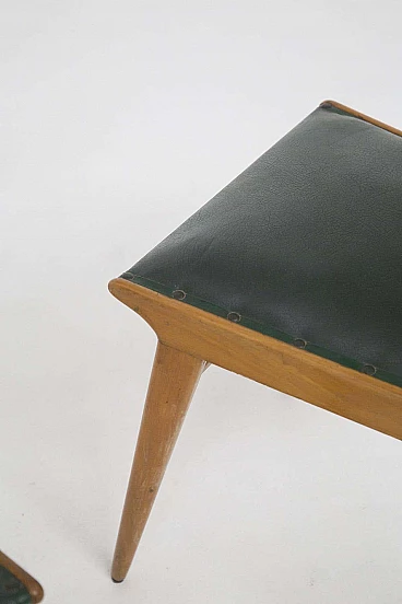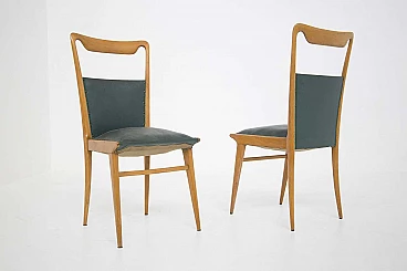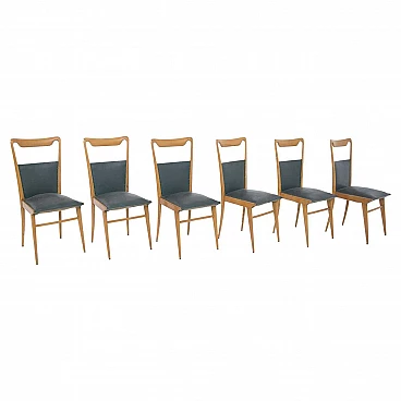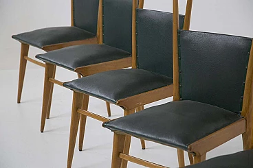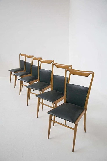 A pretty set of six wooden chairs designed in the 1950s, of fine Italian manufacture. The structure of the chairs is linear, with four load-bearing, pointed legs, while the backrest is straight with a slightly curved cut of the wood. The chairs are made entirely of light wood in the frame, while the seat is made of dark green leather. The seat and backrest are connected: in fact, the leather upholstery rises from the seat to the centre of the backrest, giving the seat a unique touch. The leather is attached to the frame by means of round brass studs in a typically vintage patina. Another special feature of the chair is the shape of the upper part of the backrest, which sees the woodwork at either end create two soft indentations, while the central part descends more, creating a beautiful ornament. The shape of the seat of the chair is also particular, as towards the outside it becomes more pointed and the wood becomes thinner, while going towards the centre of the seat the wood is thicker and reinforced. The chairs are very beautiful and are ideal for furnishing vintage dining rooms or important tables.