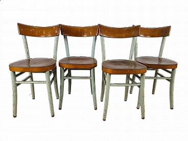 Group of four beech chairs, 1950s. Natural seat and backrest, light blue painted structural parts.
