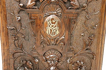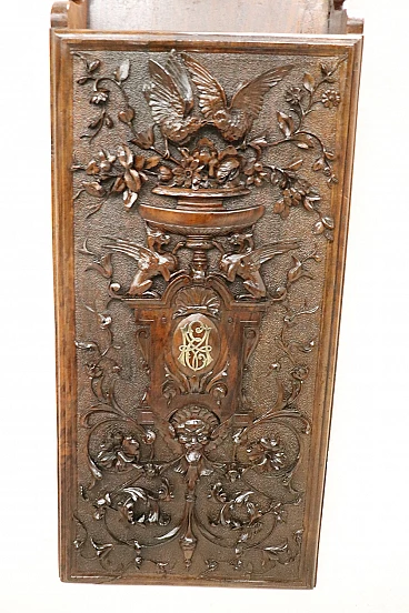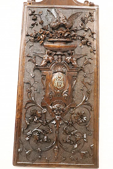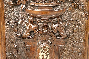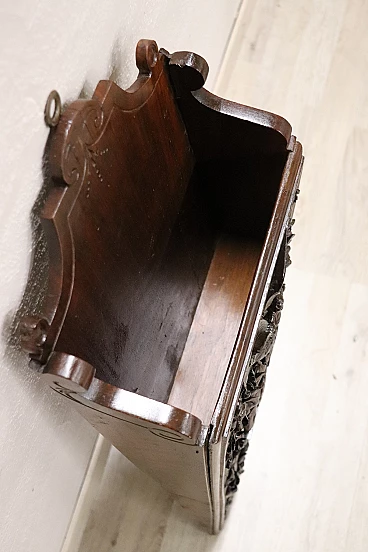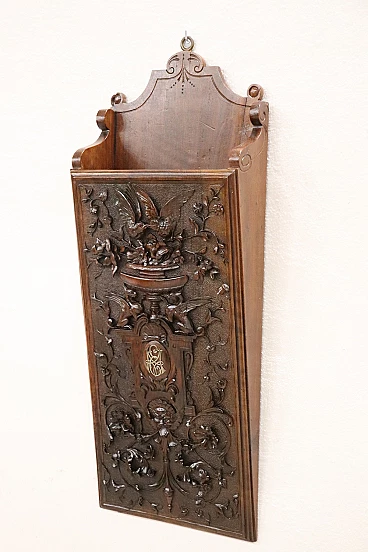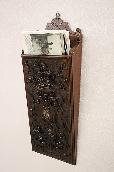 Beautiful Renaissance-style wall-mounted magazine rack from the second half of the 19th century. Made of carved walnut wood. Characterised by a refined and elaborate decoration carved in wood. There are many decorative elements in Renaissance style such as two winged dragons and a grotesque face. In the centre are two gilded bronze initials E, M probably of the person who commissioned this magazine rack from the cabinetmaker. This magazine rack is to be fixed to the wall. Perfect condition. However, we recommend that you take a close look at all the attached photos. Offered at an excellent negotiable price, we invite you to send us your suggestions for purchase, we will gladly consider them. Height 80 cm, width 30 cm, depth 12 cm. Professional packaging, insured shipping by courier, delivery by appointment only on street level, no porterage on floors.