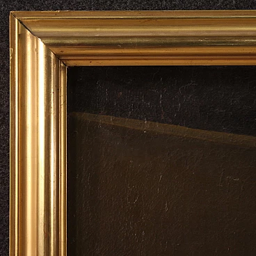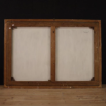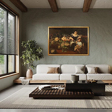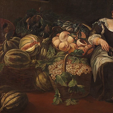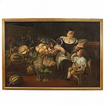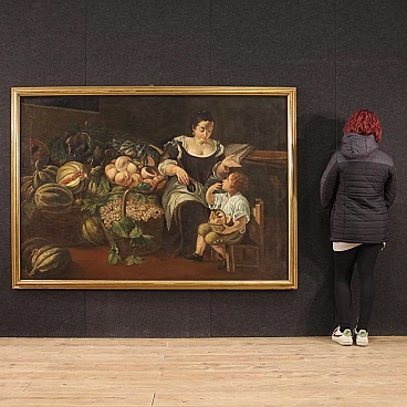 Old Italian painting from the 18th century. Oil painting on canvas depicting genre scene with fruit seller and still life of good painterly hand. Painting of exceptional size and impact adorned with a beautifully decorated modern sculpted and gilded frame. The pleasant scene on the right in which a woman hands a fruit to a child is a simple pretext for the spectacular display of a rich still life with fruit. An ideal work to place in an important hall or salon, for antique dealers, interior decorators and still life collectors. Painting that has recently undergone conservation restoration, re-staining, frame replacement and colour restoration in places (see photo). Painting in overall good condition. Light painting H 132 x W 192 cm.