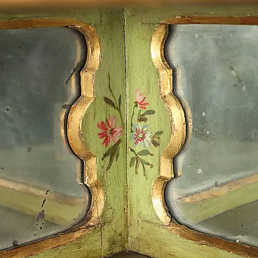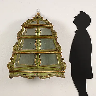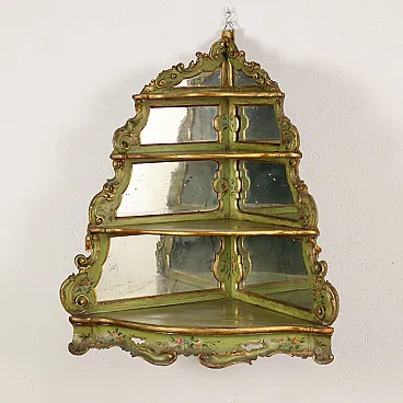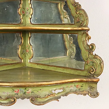 Rococo style hanging corner unit made in Venice in the late 19th century. Lacquered and gilded wood structure with curl-shaped and rocaille carvings and painted floral motifs, shelves with mirrors.
