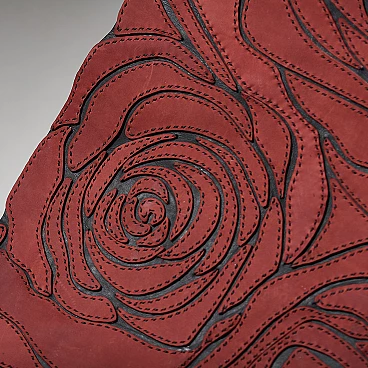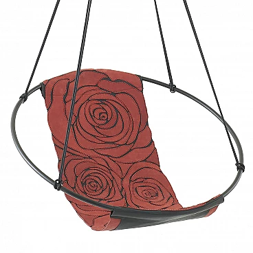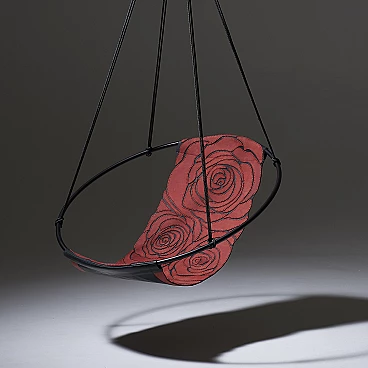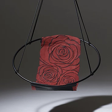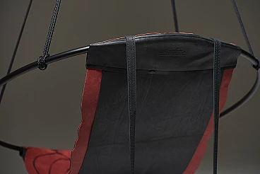 Stripped of all excess, this suspended chair has a circular frame with leather sheets hanging loosely inside to create an elegant, sexy and oh-so-comfortable experience. The rose design and elegance of this chair make it perfect for any space. Combining the purity of simple tubular steel with the sensual warmth of natural leather, it has an elegant appearance and an air of functional elegance. Each of the more than 80 rose petals is hand-cut and hand-sewn into a second piece of soft leather, creating a contrast between the two different colours. The beautiful rose sling is available in 3 standard colour combinations and can be made in other colours and combinations on request. (Please ask for a new combination for which a surcharge applies for customisation) The standard colour combinations are Black and Red, Grey and Black and Grey and Pink. A particularly striking feature of this sling is the hand-stitched detail, which adds individuality and elegance to the look and feel. To save time and money, the stitching can be done by machine. This model is also available as a carved option: the image of the rose is carved into the thick Vegetable Tan, leaving a depression or valley of undyed leather. This thick Veg Tan option gives a stronger look and feel than the softer look and feel of the soft leather option. Each model is carefully handmade by our craftsmen. Form-fitting comfort, perfect for interior spaces. Leather blanket/padding not included in this model - at extra charge. Blankets depend on stock availability. The beauty of leather is that every leather has natural marks and characteristics, which means that each piece is unique, with its own personality. We accept these characteristics and the individuality of the leathers we use. There may be slight variations in colour. The craftsmanship and skill of the artist's hand is an intrinsic part of the making of your particular piece, a characteristic we celebrate as part of the creative process. As you live with the product, the leather evolves. With the right care, the appearance of your newly acquired piece will retain its beauty, developing its own character and patina. We support hand-crafted products that demonstrate the unique skill of the craftsman and support unique pieces and design variations due to the handcrafting process. In a world of homogenized mass production, handmade products with slower designs require less energy than mass-produced ones and often last longer, reducing the waste cycle in our throwaway culture. The Sling chair can be disassembled and split in half for flat packing - a great way to save on packaging and transport. Made in South Africa. The cushion cover is not included in this model. Beautiful and modern, contemporary and unique. Choose from 3 colour combinations, handmade. Including suspension mechanisms in standard lengths, max. load capacity 120 kg. Made of mild steel/stainless steel on request (surcharge applies). Powder-coated and treated against rust.