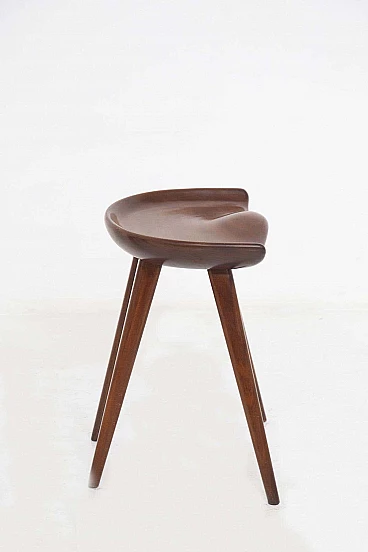Pair of sculptural Danish design stools, designed by designer Mogens Lassen in the 1970s. The stools have a beautiful sculptural and iconic line. Its very fluid and harmonious lines denote great woodwork. Its finely carved seat has a very cosy shape, in fact it seems to be stitched to the human form, making the person sitting there very comfortable. Carved mahogany wood. The four conical legs are in line with the seat. This unusual pair of stools has a truly eccentric and sculptural design. Thanks to its shape, the stools are ideal for minimalist, conceptual designs and modern living rooms.
