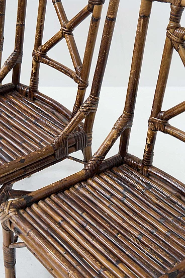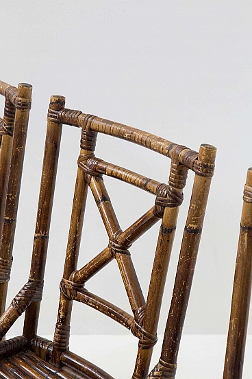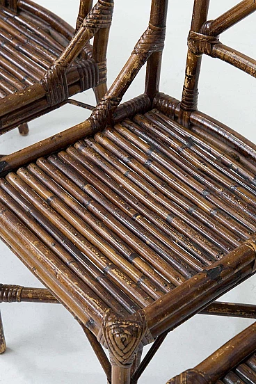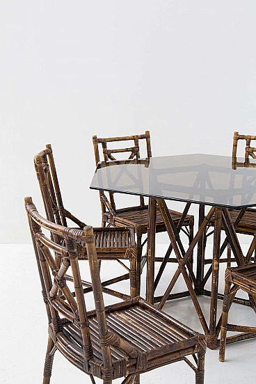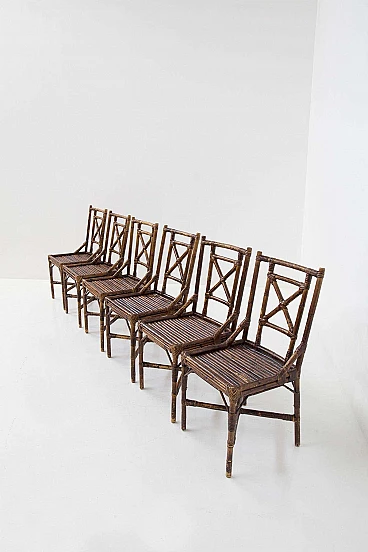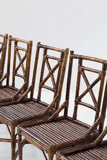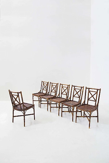 Elegant and bohemian in style, we offer a set of six chairs from the great Italian manufacturer Vivai del Sud. The set dates from the 1970s. The set is strictly made of varnished bamboo cane. The great skill in the composition and workmanship of the bamboo is evident. Each component is sealed and anchored together with rattan threads. The technique of anchoring the rattan is also done with great skill and craftsmanship. Its lines are very geometric and clean, in fact we find that even the seat is made of a series of bamboo rods that create an excellent geometric play. Another special feature are the legs, also made of bamboo but with an X-shaped structure that serves to reinforce the seat. To complete the set we recommend the hexagonal table. The chairs are ideal for bohemian settings or retro safari-jungle style living rooms, but are also perfect for those who wish to furnish their home with natural elements in a chic style.
