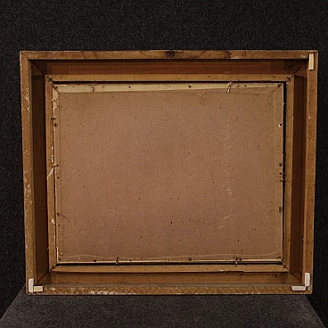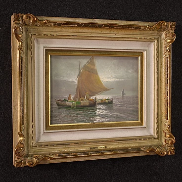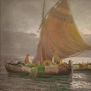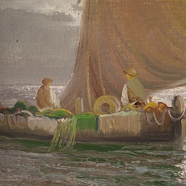 Oil painting on canvas glued on cardboard depicting a seascape with boats and fishermen at dawn, mid-20th century. Signed lower right "Remo Testa" (the signature is slightly hidden by a wooden passe-partout); missing authentication. Fitted with carved, lacquered and gilded wooden frame (bronze tint). Without the frame it measures 24 x 34 cm. It is part of a diptych: https://www.intondo.com/en/products/57106/art/paintings/remo-testa-painting-of-fishermen-at-sunset-oil-on-canvas-1950s (for more information contact the seller directly).