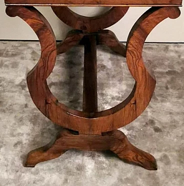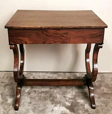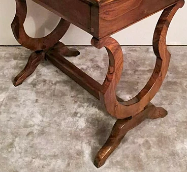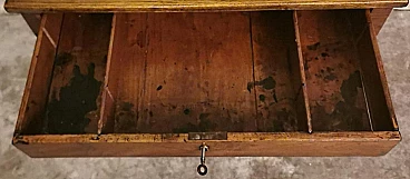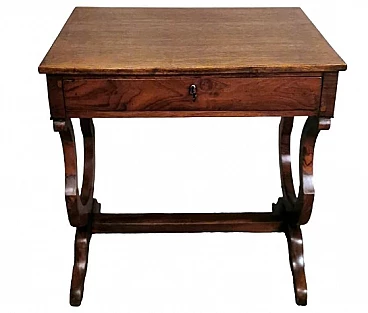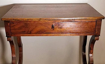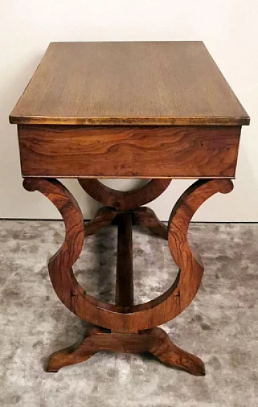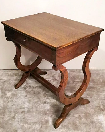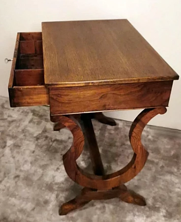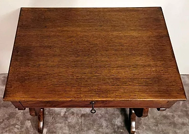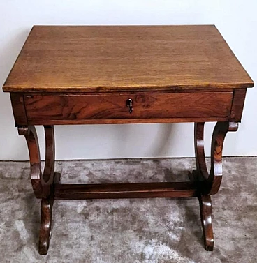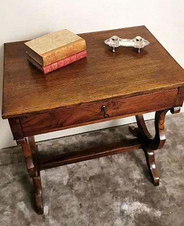 Biedermeier style fine oak writing desk. The rectangular top is well proportioned; below there is a drawer with inner dividers equipped with a lock with key and the whole is supported by two elegant and solid supports in the shape of a stylized lyre, separated from each other by a massive footrest that fits perpendicularly with two sturdy structures that firmly hold up the desk with four support points. The worn look of the inside of the drawer is very interesting, with stains of various kinds but mainly of old ink; this leads us to think and imagine which and how many people took turns using the desk. Our fantasies were subsequently confirmed by the antique dealer from whom we bought it at his shop in Bourg-en-Brasse (ancient French commune, capital of the Ain department of the Auvergne-Rhône-Alpes region); the antiquarian assured us that the desk was made between 1870 and 1880 by a carpentry shop in the area, which closed in 1932, and was used in the laboratory of the village pharmacy, which is one of the oldest pharmacies in France as it was founded in 1782. Right in the south wing of this imposing and ancient building was the laboratory where the apothecaries prepared infusions, decoctions and other medicinal remedies for years and whose recipes were probably written on this desk. The antiquarian took possession of it several years ago, when the pharmacy was transformed into a hotel-museum (see photo) and abandoned part of the furnishings. This desk, rich in history, is aesthetically a sober and harmonious piece of furniture, in which the taste for curved lines, typical of the Biedermeier style, is emphasized to the maximum. The object is in good condition, no restoration has been carried out to maintain the beautiful patina which attests to its antiquity and authenticity.