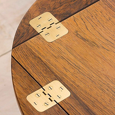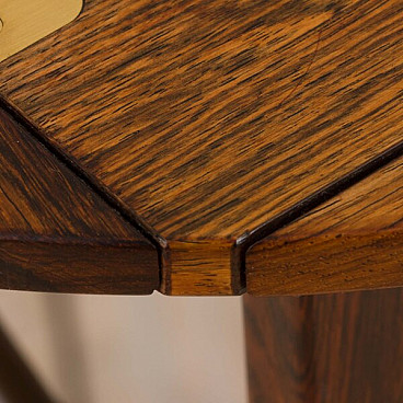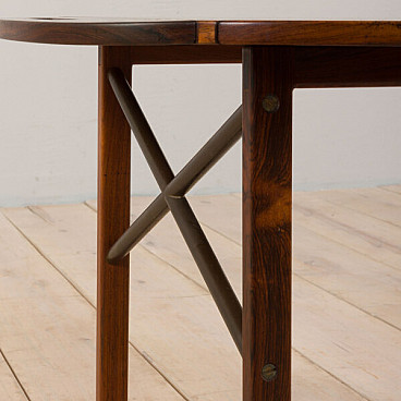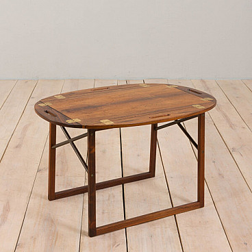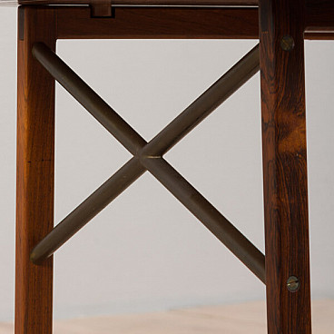 A splendid butler's tray in Brazilian rosewood designed by Svend Langkilde for Illums Bolighus dates to the 1960s. It features a solid wood base with wooden cross stretchers and a removable top with beautiful rosewood grain. Each side of the top holds a handle and is attached to the top by brass hardware, so they all lift up, creating an easy-to-carry tray. This piece of furniture is an impressive side table or a practical object for a romantic breakfast in bed.