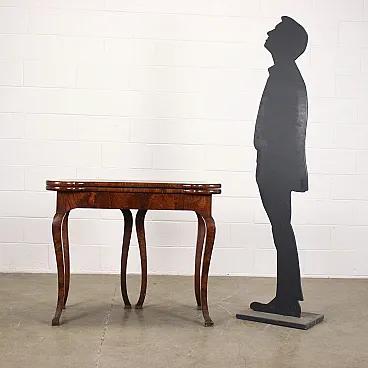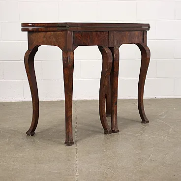 Barocchetto game table with folding top, 18th century. Walnut structure veneered with walnut root on the top and on the outside of the legs. Two of the legs can rotate so as to support the top when open. Inner drawers were added later. When it is open the top measures 98 x 95 cm. Due to age it requires restoration work and re-polishing.