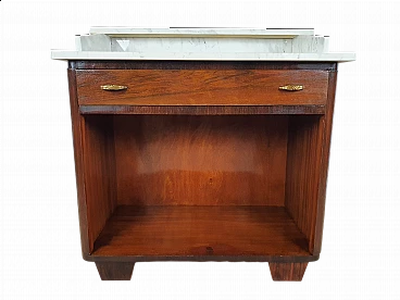 Art Deco wood vanity table with marble top, 1940s-50s. Equipped with large open compartment in the lower part and drawer with brass handles in the upper one. Marble is only leaned on the wood structure. The furniture has been polished with oil and shellac.