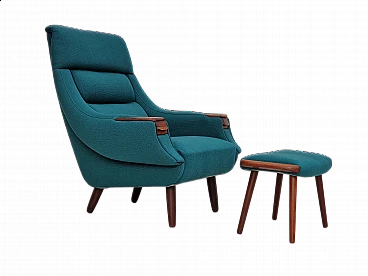 Danish design armchair by H.W.Klein for Brammin Møbler, 1960s. Refurbished upholstered armchair with stool. Upholstered in teal wool fabric. Refurbished teak legs, teak nails and removable ashtray. The original seat springs have been retained. Refurbished by a professional upholsterer, craftsman.