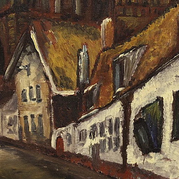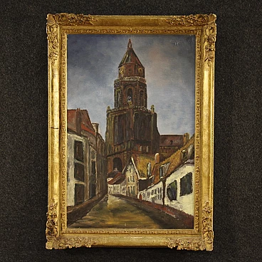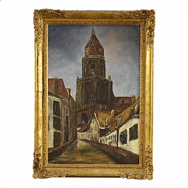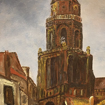 Dutch Impressionist-style painting of a view of a cathedral, oil on canvas, 1960s