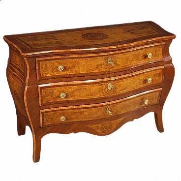 20th century Italian dresser. Moved and curved Louis XV style cabinet inlaid in walnut, bois de rose, maple, briar and fruit woods. Chest of drawers of beautiful line and pleasant furnishings with three drawers of good capacity, complete with three working keys. Wooden upper surface in good size and service with some minor signs of wear. Dresser adorned with rosettes on front, sides and top (see photo). Chest of drawers ideal for inclusion in a bedroom or living room, for antique dealers and interior decorators. Cabinet is part of a complete set of bedside tables (see photo and ask for block price if available). Structurally sound and in good condition.