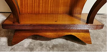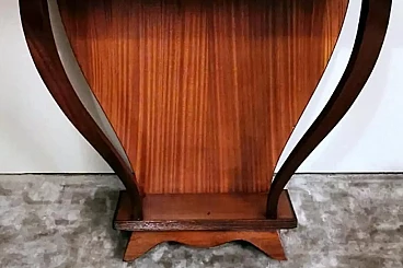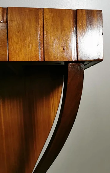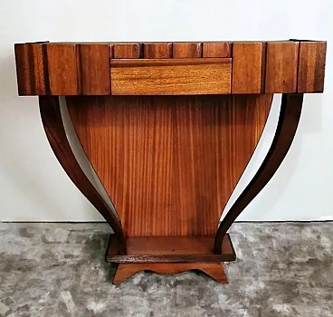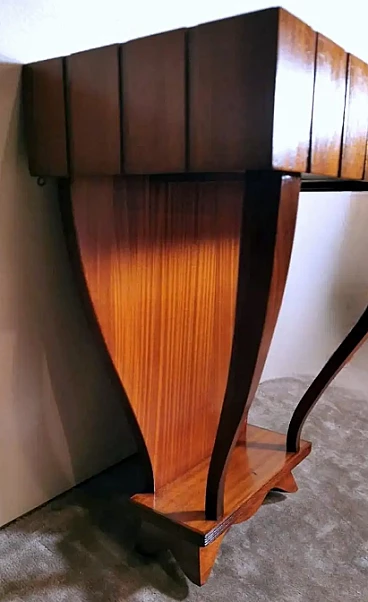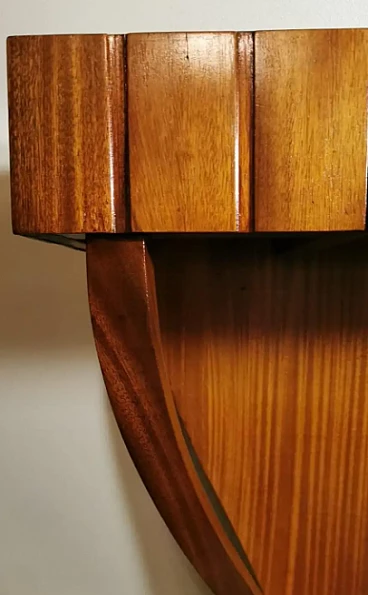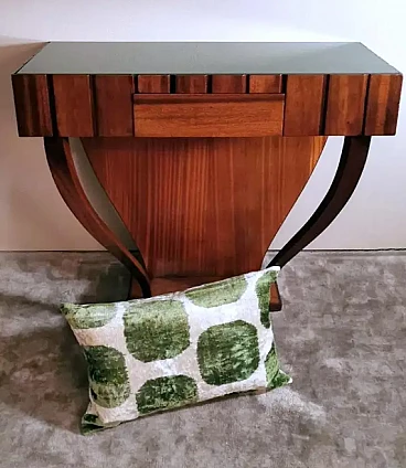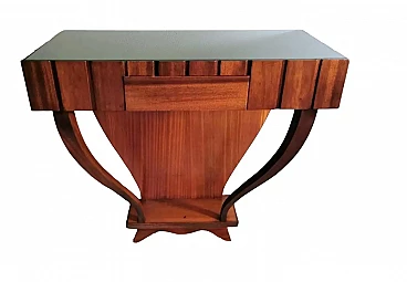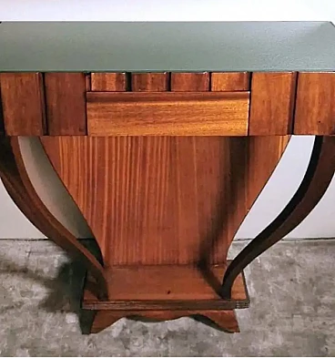 Art Deco style console; a green glass was placed on the rectangular plane; to obtain the colour, a special film was applied hot on the bottom of the glass plate, which allows, looking at the glass from above, to enjoy the beautiful colouring. The structure is linear and essential; the two legs, which connect to the lower base, have a soft and sinuous line, which contrasts pleasantly with the design of the entire piece of furniture. The console is equipped with two hooks on the back to be fixed to the wall. The console was made between 1950 and 1954, by a skilled master craftsman in a perfect and meticulous way in the Lendinara area, in the province of Rovigo (Italy), one of the most famous districts for the production of furniture in Veneto. For the construction of the console, sapele was used, a prestigious reddish wood similar to mahogany from Equatorial Africa; this sophisticated material has a tight weave and interwoven fibers, fine and uniform and with a good natural sheen. It is a robust, rather flexible, hard and compact type of wood, usually used for luxury furniture and cabinet-making, but also for furnishing yachts and boats, as well as for sophisticated and expensive musical instruments.