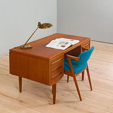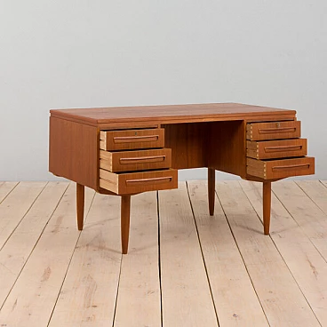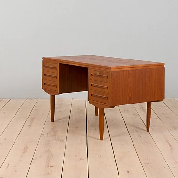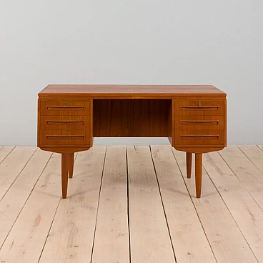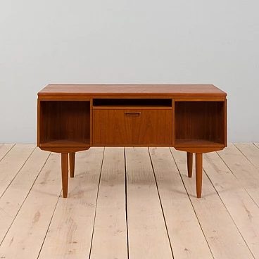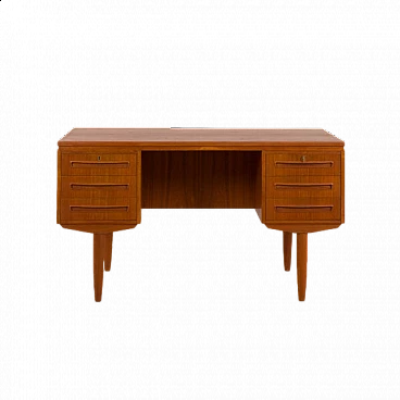 This classic mid-century teak desk, designed by J. Svenstrup for A.P. Møbler Denmark in the 60s, inspires the eye with cute geometric details in solid teak. It features six drawers with pull-out handles, two top drawers with locks (original key included), etc. At the back it has a wet bar and two open shelves for storing books, catalogues, etc. The solid teak legs are removable to ensure more comfortable transport. This piece of furniture is in excellent period condition, with some minor marks commensurate with age and use. Refurbished with additional coats of Danish oil to bring out the beauty of the wood grain.