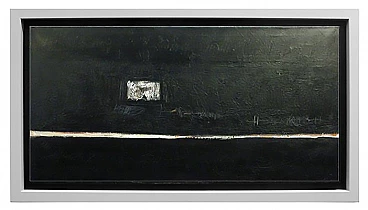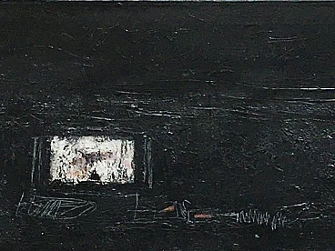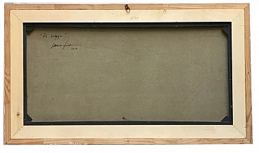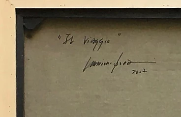 Mixed media painting on canvas entitled "The Journey" made by Massimo D'Orta in 2011. D'Orta was born in 1950 in Naples, the city where he still lives and works. He has been producing continuously for about thirty-five years but has rarely exhibited, as if his vision of making was similar to that of the Paleolithic painter who made his graffiti in the darkest part of the cave not for an aesthetic purpose but to satisfy a psychic need, to soothe his own fears and anxieties. The work seems to hide an enigmatic ancestral and primitive message that requires a strenuous but compelling journey into the human psyche to grasp the essential aspects and innermost meanings of modern man. A modern wooden frame is available upon request. Size without the frame: 60 x 120 cm.