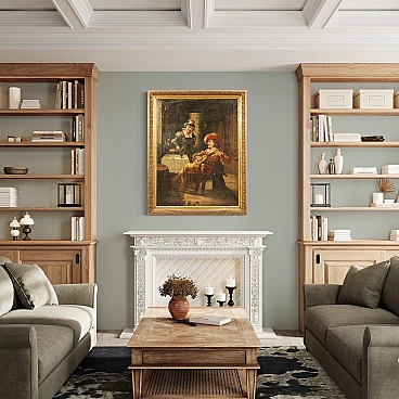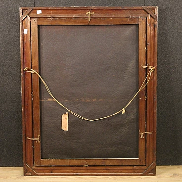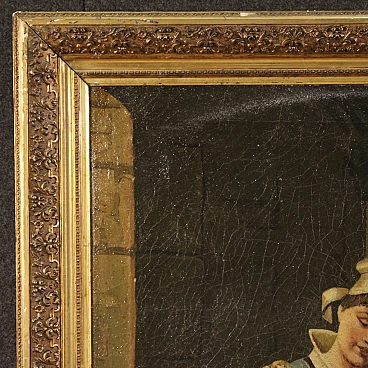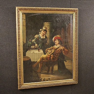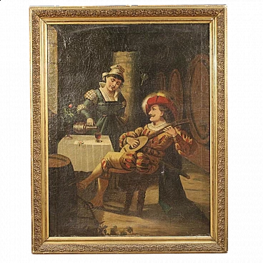 Large Italian painting from the beginning of the 20th century. First oil painting on canvas, depicting interior scene with musician with a good painting hand. Painting of great size and impact, with pleasant decoration. Non-coeval wood and plaster frame, carved and gilded, of beautiful decoration. Frame showing some minor colour fading (see photo). Canvas with a vertical crack in the bottom right-hand corner (see photo), in need of restoration. Painting overall in fairly good state of preservation. Light painting H 121 x W 92 cm.