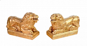 Pair of carved, chalked and gilded wooden lions. Italy, 17th century. Dimensions H 20 cm, W 29 x 11.5 cm. The pieces are in good condition, as can be seen from the attached photos. They have missing parts in the plasterwork visible in the photos. Please evaluate through the photos.