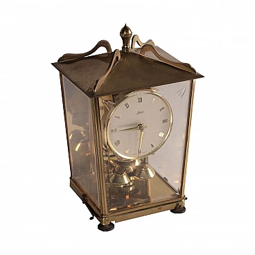 Table clock in brass and bevelled glass with visible mechanism. Exhibit with Roman numerals hours and stamped manufacture mark. Object in good condition, mechanism not tested.