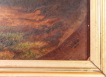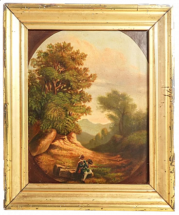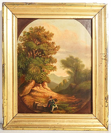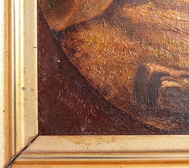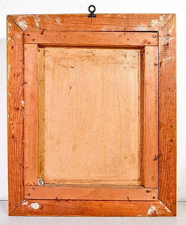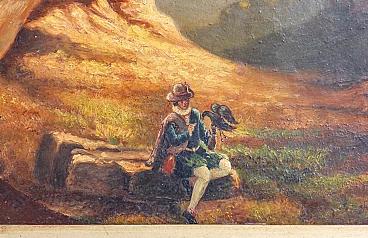 Oil painting on cardboard depicting "The Falconer in the time of Henry IV," signed "A. Camussi" and dated February 1860. Despite the signature, the identity of the artist could not be traced. Measurements without frame: 31 x 39 cm. Measurements with frame: 40 x 48 cm. The painting is in very good condition; the frame has lacks in the plastering, particularly in the edges, and a few marks.