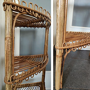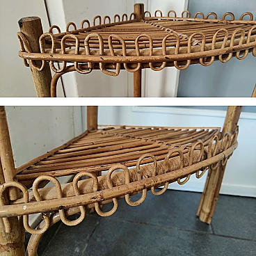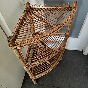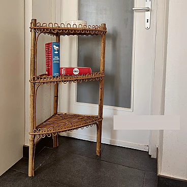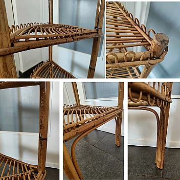 Small three-shelf bamboo bookcase, 1970s Italian handicraft production. Triangular in shape with three shelves made of bamboo with woven decoration along all edges.