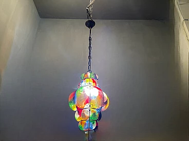 Wrought iron and multicolor Murano glass hanging lamp, 1950s. Total height: 80 cm. Height of the lamp alone (excluding chain and canopy): 40 cm. It has been rewired and is compatible with Europe, UK and USA.