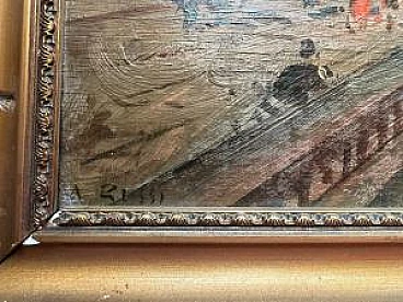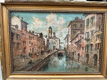 Oil painting on panel from the 20th century depicting a view with a canal. Signed at lower left.