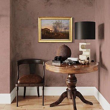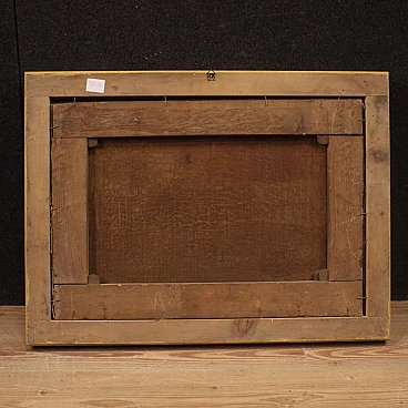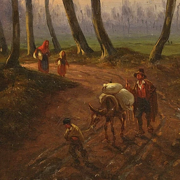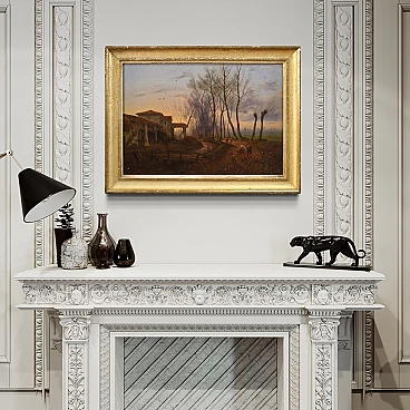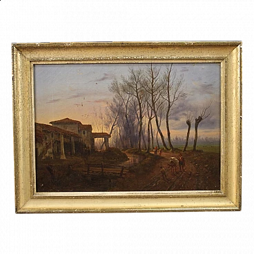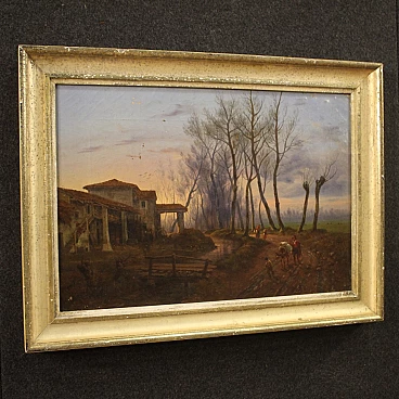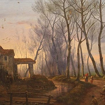 Old French painting from the second half of the 19th century. Oil painting on canvas depicting country landscape with peasants and wayfarers by a good painterly hand. Wood and plaster frame, not contemporary, from the 20th century, carved and silver-plated. Frame with some signs of time and minor colour fading, to be restored (see photo). Work is part of a pair (see photo and ask for block price if available). Pleasantly sized and beautifully decorated painting rich in detail and decorative elements. Painting in first canvas and first patina, with some signs of time and minor colour fading. Overall in fairly good state of preservation. Light painting: H 44 x W 64 cm.