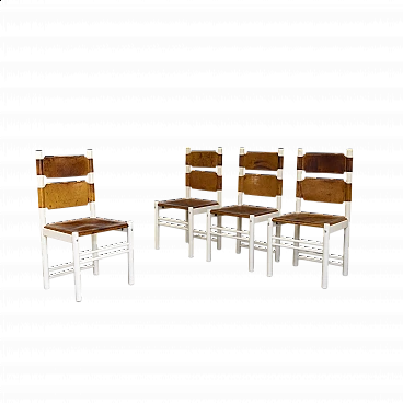 Set of 4 chairs in white varnished wood, seat and back in cognac colored leather. Ibisco production from the 70s.