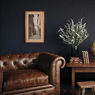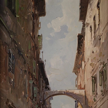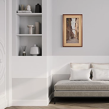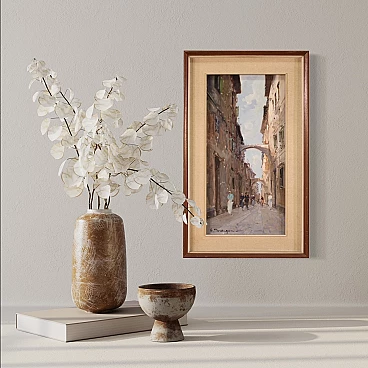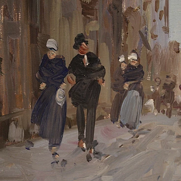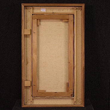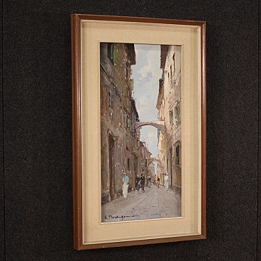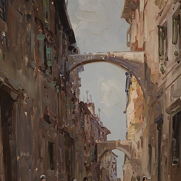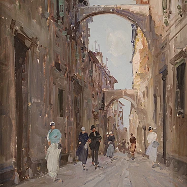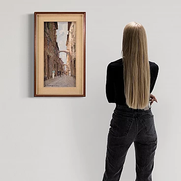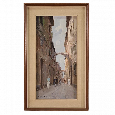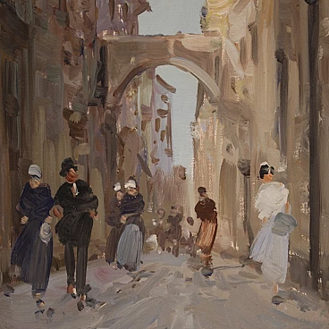 Italian painting from the second half of the 20th century. Oil on canvas painting depicting city view with characters in Impressionist style with a good painterly hand. Small-sized, vertical painting with wooden frame complete with fabric passe-partout (see photo). Painting signed bottom left (see photo) A. Marangoni referable to the painter Aldo Marangoni (20th century) lacking authentication. Painting that creates a pleasant colour contrast between the blue above and the darker colours of the houses and the street. The colour reference in the maidens' clothes to the colour of the sky is delightful (see photo). Painting is part of a pendant (see photo and ask for block price if available). In good condition with some minor signs of time. Light painting H 58.5 x W 28 cm.