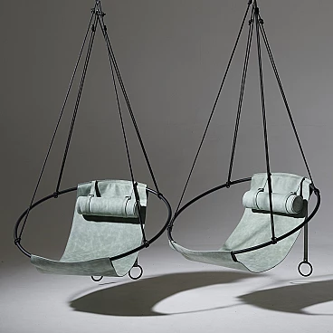 Deprived of all excess, this hanging armchair has a round structure with a leather seat that hangs freely inside, elegant yet comfortable, perfect for any space.