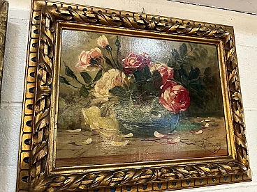 Pair of paintings with roses, oil on panel by A. Lomagno, early 20th century