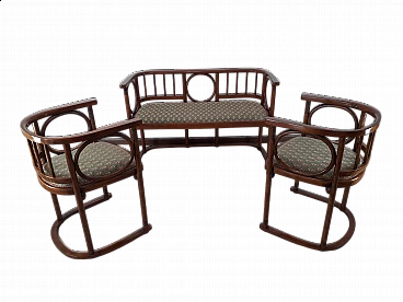 Fledermaus sofa and pair of armchairs by Josef Hoffmann for Thonet - Mundus, early 20th century. Wood structure and seats upholstered with Backhausen fabric. This model is already in the catalog in 1907 but recent documented historical research shows that already in 1905 it was present in the apartment of the architect Gustav Siegel, hence a doubt on the paternity of the model to Hoffmann; it is probably a case of cooperation between the technical study directed by Siegel and the independent work of Hoffmann. This model, compared to the more common one by J. & J. Kohn, has the circle and not the rhombus under the armrests. The armchairs are 74 cm high, 55 cm wide and 53 cm deep.