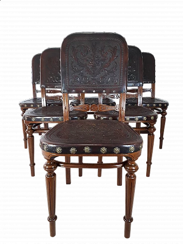 Very rare Thonet chairs from the end of the 19th century, entirely original in every part... there is not a screw that is not theirs. Chairs made not in series but on commission for the high nobility of Vienna, the so-called 'Adelfamilien'. According to the label and the type of stamp, both on the chair and on the leather, they can be dated to 1981. High workmanship of curved beech wood with details such as turned front legs and rectangular backrest. Original vintage leather with signature of the master who did the workmanship and moulding of the famous Thonet Lily. Exclusive brass flower studs on seat and backrest. The attention to detail can be seen on the backrest, which has also been worked at the rear. A stud is missing on one seat but is not noticeable and one seat has a ruined bottom. These are details that are not noticeable and have complications on the chair but in the interests of fairness we wanted to make the eventual lucky buyer aware of them.
