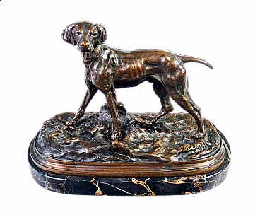 Bronze sculpture of a Bracco, hunting, retrieving and pointing dog. Marble base. 20th century. Dimensions H 16 x 21 x 10 cm. Perfect condition. Evaluate through attached photos.