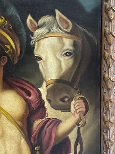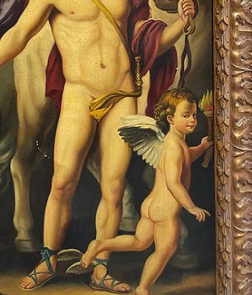 This is a reinterpretation of a large antique painting 'Perseus and Andromeda' by the German painter Anton Raphael Mengs. Mengs' production is linked to the fundamental principles of Neoclassicism. Not surprisingly, his works are characterised by very balanced and symmetrical compositions, clear drawing and a palette composed of very bright and vivid colours, in contrast to the muted colours of Rococo. With these characteristics Mengs tended to achieve a state of 'sublime beauty', shared by other classicist painters living in Rome in the 17th century, such as Andrea Sacchi and Nicolas Poussin. The work is inspired by a cameo that belonged to his wife and is now in the Hermitage, where the painting is also on display. The theme is taken from the myth of Perseus and Andromeda, specifically from the moment of the scene with Perseus who has already freed Andromeda from the terrifying monster, lying lifeless on the ground, and is carrying her to safety, thanks also to the help of the winged horse Pegasus.