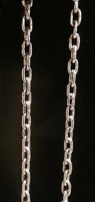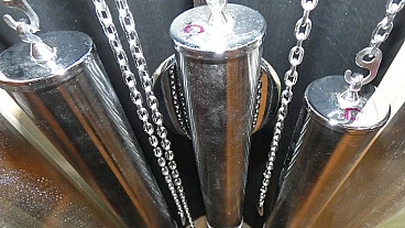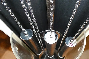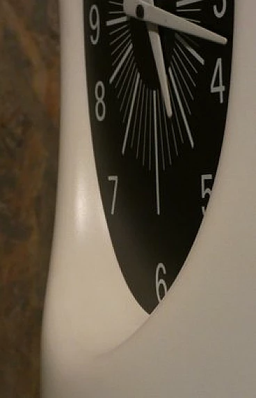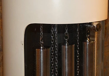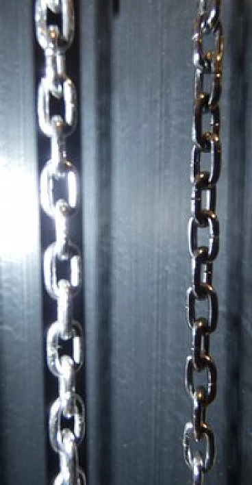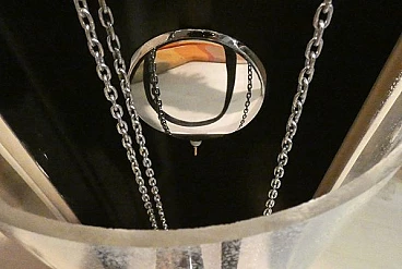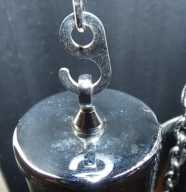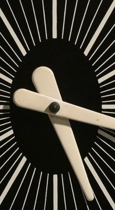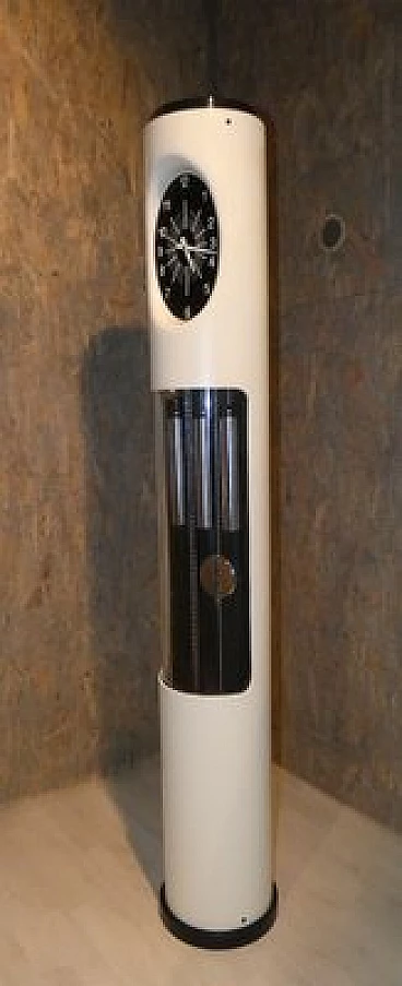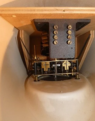 Pendulum clock, 1970s. This clock has a very special history: it is a prototype that has been kept in its creator's home for over fifty years. The opportunity to have this object arose from a meeting in the store with an elderly gentleman, a watchmaker employed in the 1970s at the Lowell clock company in Modena. He explained that in those years the company wanted to come up with some innovations in the market for classic pendulum clocks and that he was the person dedicated to create the prototypes, which would then be screened for mass production. This model was not chosen and he took it home, where it has remained for over fifty years. The clock is perfectly functioning, hand-wound, operated by chrome-plated steel chain gears, at the ends of which are three counterweights of different weights that mark time by descending. The plexiglass front compartment is sliding, thus facilitating winding operations. The maximum charge provides a six-day autonomy. The clock chimes the hours, half hours and quarter hours, with three different combinations, as the sound is produced by four independent brass hammers. The body of the entire clock is made of lacquered multilayer wood. Since this object was born as a prototype, it does not have the manufactory mark.