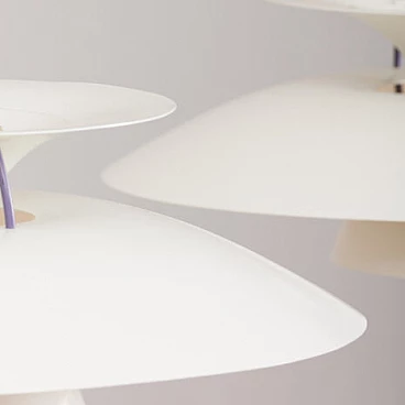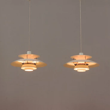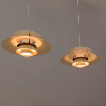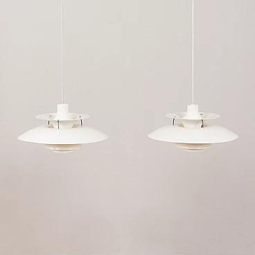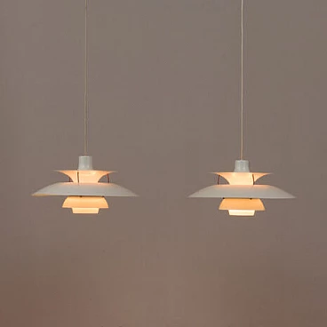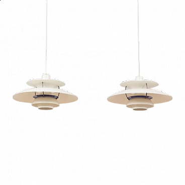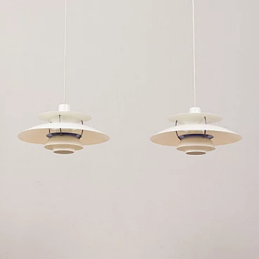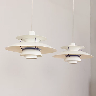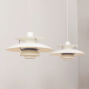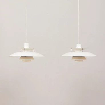 Pair of white PH5 lamps designed by Poul Henningsen for lighting manufacturer Louis Poulsen. PH5 is one of the best-known Danish pendant lamps, first introduced in 1958 and has since become an iconic piece of mid-century modern design. The design intent of PH5 was to provide glare-free lighting, thanks to the lampshade with several concentric shades that work together to diffuse the light and prevent any glare. The lamp is also equipped with a curved trumpet-shaped reflector that directs the light downwards, creating a soft and warm light.