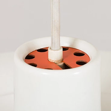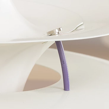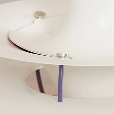 The set presented is white and features blue plates and purple construction details. Overall, in fantastic original vintage condition with no significant scratches or dings. Some of the discs may be 'extinguished' but this does not spoil the aesthetics of the lamps and is a common feature as aluminum is a soft material. It is not visible when the lamps are hung, as in the photos. Manufacturer's label preserved. Original wiring with 128 cm long cable, extendable or shorten on request.