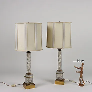 Pair of beveled crystal and bronze lamps with fabric shades
