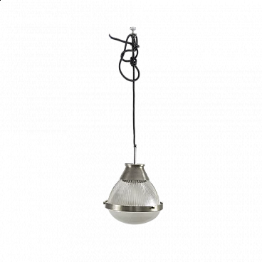 Suspension lamp mod. 4409 with chrome-plated metal structure. Moulded glass diffusers. Prod. Oluce, Italy, 1958