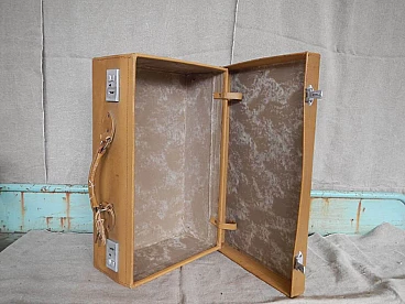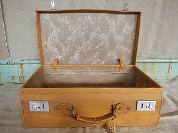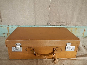 Leather suitcase with decorated paper interior and key for locks, 1930's.