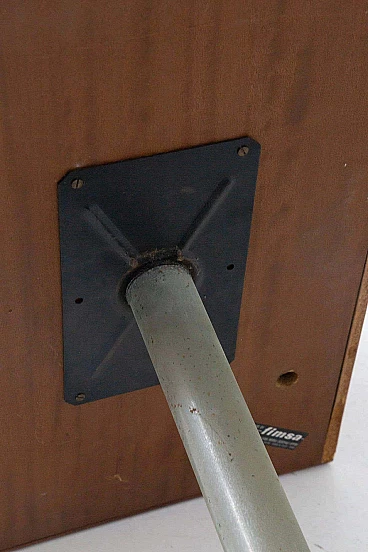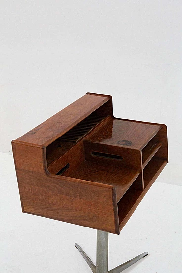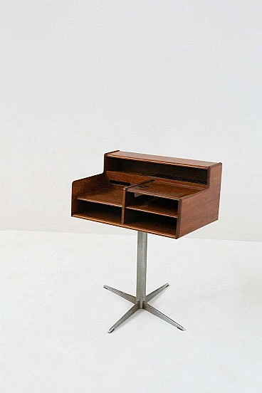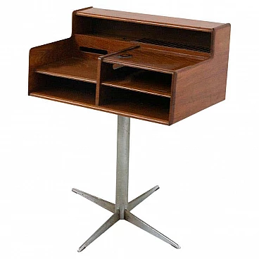 Small Italian desk made by Fimsa Roma in wood and metal in the 1950s and 1960s. The small desk has several compartments to hold small objects. The desk is made of wood as a structure and has three document shelves, while on the inside we find various perforated modules in the wood for inserting envelopes, documents or stationery. At the base we notice four chrome-plated metal feet with a pedestal of the same material. Under the small desk we find the Fimsa manufacture label. The desk is a lovely design and decorative element to complete the corners of the office for those who lack space. This small piece of furniture is ideal for furnishing study areas or living rooms in a modernist style.